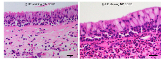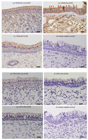 Representative immunohistological images showing T2R38 (a–c) and T2R14 (e–g) protein distribution in ethmoid sinus and nasal polyp mucosa sampled from non-ECRS and ECRS patients. Isotype negative controls for T2R38 (d) and T2R14 (h). HE staining images of (i) ethmoid mucosa and (j) nasal polyps obtained from the same ECRS patient. Epithelial ciliated cells stained positive for T2R38. Higher rates of staining were observed in epithelial cells in ECRS patients along the ciliated luminal surface (Figure 4b, arrowheads). In contrast, secretary goblet cells in the epithelial layer generally show a lack of staining (Figure 4c, asterisks). Positive T2R14 immunoreactivity is localized mainly to epithelial cells with cytoplasmic staining. Scale bar: 20 μm.