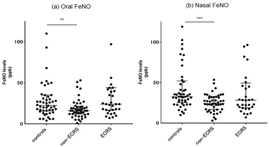 (a) Oral FeNO and (b) nasal FeNO levels in control subjects and non-ECRS and ECRS patients. ** p < 0.01; *** p < 0.001; FeNO, fractional exhaled nitric oxide. Center lines, median values; error bars, interquartile ranges.