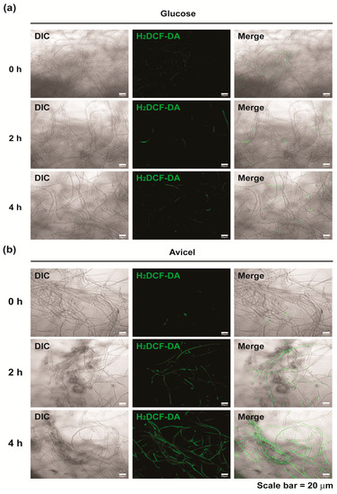 To detect intracellular ROS and NO, fungal mycelia were harvested at 0, 2, 4, 24, 48 h after incubation in glucose or Avicel medium. The harvested mycelia were stained with 20 μM 2′,7′-dichlorodihydrofluorescein diacetate (H2DCF-DA, Themo Fisher, Waltham, MA, USA) and 20 μM 4-amino-5-methylamino-2′,7′-difluorofluorescein diacetate (DAF-FM DA, Themo Fisher) for intracellular ROS and NO, respectively, at 25 °C in the dark for 1 h.