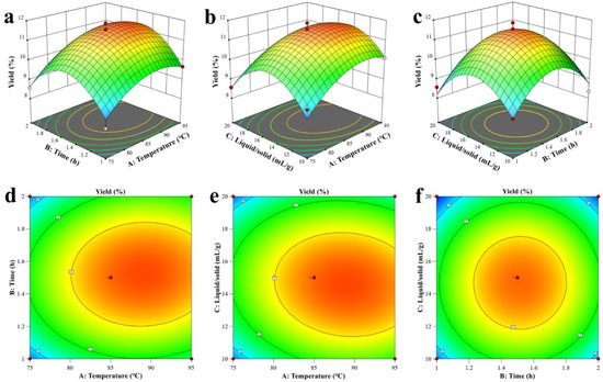 Results of response surface analysis. Response surface plots of the interactions between extraction temperature and time. (a) Extraction temperature and liquid:solid ratio. (b) Extraction time and liquid:solid ratio. (c) A, B, and C represent the extraction temperature, extraction time, and liquid:solid ratio, and (d–f) are their contour plots, respectively.