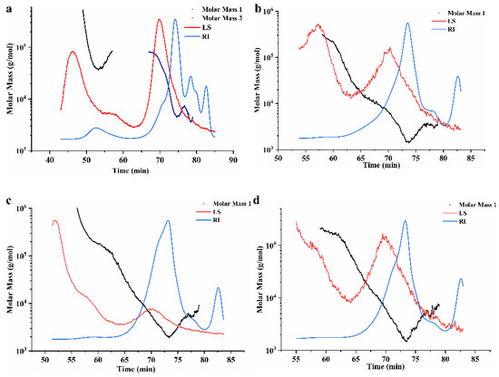 High-performance size exclusion chromatograms of P. notoginseng polysaccharides. The LS refers to the multi-angle laser light scattering signal; RI is the indication difference signal; Molar mass is the molecular weight fitted by two signals. The molecular distribution of PP (a), PP3 (b), PP5 (c), and PP7 (d).