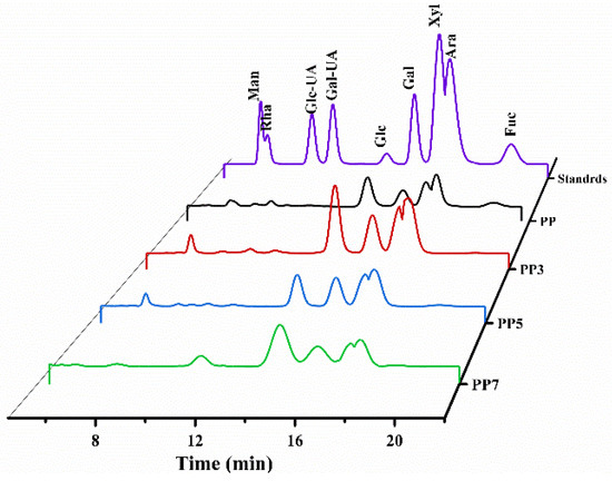High-performance liquid chromatogram profiles of compositional monosaccharides of PP, PP3, PP5, and PP7.