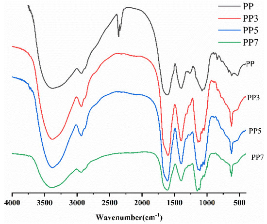 FT-IR spectra of PP, PP3, PP5, and PP7.