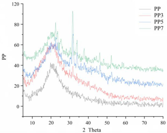 X-ray diffraction pattern of PP, PP3, PP5, and PP7.
