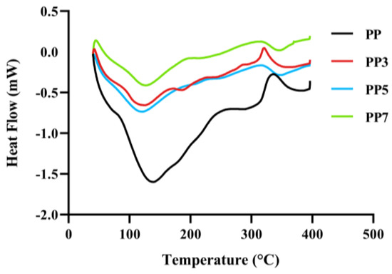 Differential scanning calorimetry (DSC) analysis of PP, PP3, PP5, and PP7.