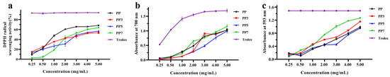 The determination of reducing power takes the amount of Prussian blue Fe4 (Fe (CN)6) as the index. The antioxidant can reduce potassium ferricyanide and then use ferrous ions to form Prussian blue. This substance has the maximum absorption peak at 700 nm. The higher the absorbance value, the stronger the reducing power of the sample. The reducing capacity of polysaccharides was related to the molecular weight and monosaccharide composition [11]. 11As shown in Figure 7b, the reducing power of PP and its degradation products were dose-dependent. Compared to Trolox, the reducing power of these four polysaccharides was weak. PP7 exhibited better ferrous ion reduction power with half maximal effective concentration (EC50) of 2.95 mg/mL, compared to the EC50 of 3.46 mg/mL PP. The oligosaccharides with a non-compact structure have more free hydroxyl groups and surface area that more easily interact with ferrous ions. The result was similar to the okra polysaccharide and its oligosaccharide, which the oligosaccharide having a higher reducing power [32].