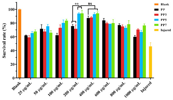 Treatment of PP, PP3, PP5, and PP7 significantly increased the oxidative stress resistance in HHL-5 cells. The values are presented as the mean ± SD (n = 3). **: Statistically significant differences between compared samples (p < 0.01), and the “ns” means no significant difference.