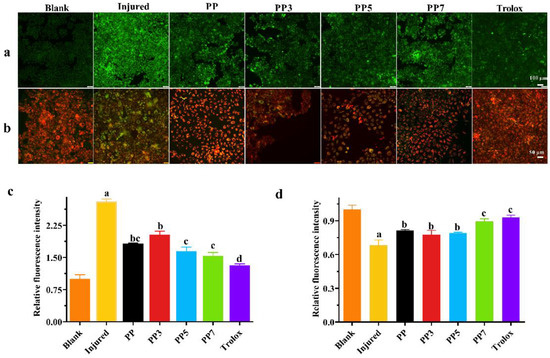 Treatment of PP, PP3, PP5, and PP7 significantly alleviates apoptosis by inhibiting intracellular ROS levels in HHL-5 cells, and different letters in the picture indicate significance, p < 0.05. (a) The depolarization of the mitochondria membrane induced the release of JC-1 from mitochondria to form JC-1 monomers. (b) JC-1 accumulated in mitochondria as JC-1 aggregates when the mitochondria membrane was intact. (c) The intracellular ROS contents in HHL-5 cells under juglone-induced oxidative stress. (d) Quantitative evaluation of JC-1 aggregates/monomers ratio.