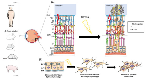 Role of EMT in PVR. (A) Depiction of PVR formation after stress factors’ impact on retinal cells: EMT and migration of RPE cells through retinal cellular layers (highlighted in red) as well as gliosis of Müller cells (highlighted in yellow). (B) EMT of RPE cells due to stress, leading to preretinal and epiretinal membranes formation: Following disruption of BRB or compromised retinal architecture due to stress (ageing, hypoxia, inflammation, or traumatism), normal cobblestone-shaped RPE cells lose their tight and adherent junctions, their apical basal polarity, and obtain a mesenchymal phenotype, which increases their migrative and proliferative abilities. These RPE cells undergoing EMT then migrate through the different retinal layers to form preretinal and epiretinal membranes. A: Amacrine cell; AC: Astrocyte; AJ: Adherens Junctions; BC: Bipolar cell; BM: Bruch’s Membrane; CC: Choroidal Capillaries; CP: Cone photoreceptors; EMT: Epithelial–Mesenchymal Transition; GC: Ganglion Cell; HC: Horizontal Cell; ILM: Inner Limiting Membrane; OLM: Outer Limiting Membrane; RBV: Retinal Blood Vessels; RP: Rod photoreceptor; RPE: Retinal Pigmented Epithelium; TJ: Tight Junctions. The Figure was partly generated using Servier Medical Art, provided by Servier, licensed under a Creative Commons Attribution 3.0 Unported license.