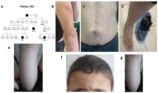 Family #102. (a) Pedigree #102. Four-generation pedigree #102 enclosed 8 nuclear families with 4 ichthyosis patients, #102.2, #102, #102.4, and their common great grandfather by their mothers; (b–d) photo of patient #102.4. Hyperkeratosis of the skin on the elbows (b), abdomen (c), dark-brown scaling on the leg and back of the foot (d); (e) photo of patient #102. Abundant “dirty” brown scales on the legs; (f,g) photo of patient #102.2. Dry scales on the forehead and hairy part of the head (f) and brown scaling on the legs (g).