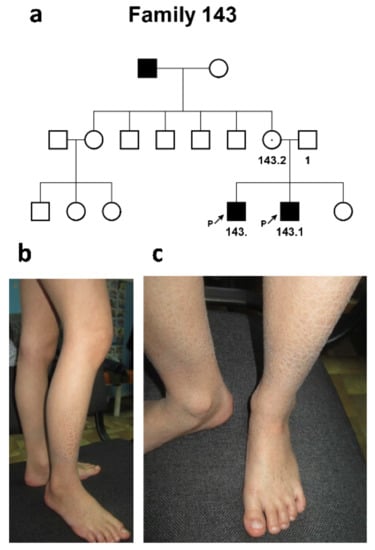 Family #143. (a) Three-generation pedigree #143 with 3 patients, 2 siblings (#143 and #143.1), and maternal father (who was not available for clinical examination and molecular diagnosis); (b,c) patient #143. Brown skin scales of various sizes, from small (2–3 mm) to larger (12–17 mm) on the leg.