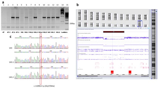 The third, Ossetian, family #143 was represented by two affected siblings and the affected maternal father (according to the mother’s words). Both of the proband’s parents were healthy (Figure 3a).