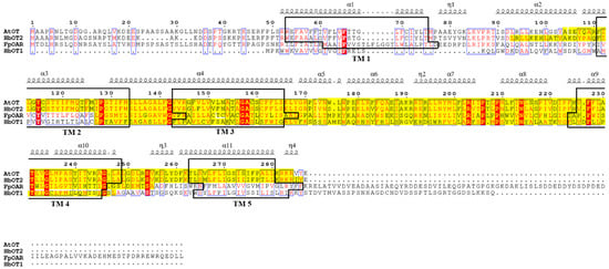 Multiple sequence alignment of FpOAR, HbOT1, HbOT2, and AtOT. Different secondary structures are labelled above a specific sequence, black boxes represent the transmembrane domains (TM1–TM5) of the protein, and the yellow highlighted fragment represents the SNARE-assoc conserved domain of the protein. Conserved and similar residues are identified by red shadows and blue boxes, respectively.
