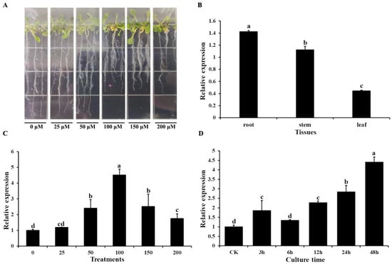 The seeds were sterilized in 75% ethanol for 2 min, 95% ethanol for 2 min, and 10% NaClO for 10 min and washed five times with ddH2O before culture. Then, the disinfected seeds were sown on 1/2 MS solid medium, vernalized at 4 °C for 48 h in the dark, and then cultured in a light incubator. The light incubator program was set to 22 °C, a relative humidity of 70%, and a photoperiod of 16 h/8 h (day/night). After growing two true leaves, the seedlings were transferred to 1/2 MS solid medium (pH = 4.2) containing Al3+. The wild-type Col-0 seedlings treated with 0 (CK), 25, 50, 100, 150, and 200 μM Al3+ for 48 h and treated with 100 μM Al3+ for 0 (CK), 3, 6, 12, 24, and 48 h were collected to extract RNA for expression analysis of AtOT in response to the concentration and stress time of aluminum, respectively.
