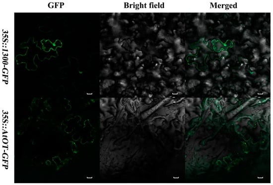 Subcellular localization of AtOT in tobacco leaves. The 35S::AtOT-GFP fusion protein was transiently expressed in tobacco (N. benthamiana) leaf epidermal cells. The bars indicate the length of 20 um.