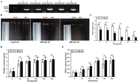 To confirm the atot mutant homozygotes, total DNA was extracted by the CTAB method from the different atot mutant plants cultured for 3 weeks. Then, the three-primer method, i.e., the LP, RP, and LBb1.3 primers (Supplementary Table S1) designed by the Genomic Analysis Laboratory of the Salk Institute (http://signal.salk.edu/ (accessed on 7 January 2022)), was utilized for the identification of the atot mutant homozygous plants. The plants which have a clear band for the LBb1.3 + RP but have no band for the LP + RP primers during PCR were identified to be homozygous atot mutants and utilized in the subsequent experiments [47]. The Col-0 and atot mutant seedlings under 0 (CK), 25, 50, 100, 150, and 200 μM Al3+ stresses for 2 weeks were randomly selected for root length recording and the determination of proline (Pro) and malondialdehyde (MDA). Pro content was determined using the proline quantitative assay kit (Nanjing Jiancheng Bioengineering Institute Co., Ltd., Nanjing, China). MDA content was determined by TBA colorimetry [48].