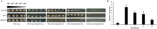 The ORF sequences of AtOT were cloned into the pDR196 vector (Zhuang Meng International Biogene Technology Co., Ltd., Beijing, China) to generate the construct pDR196-AtOT by homologous recombination using specific primers (Supplementary Table S1) and then transformed into yeast mutant AD1-8 (Δyor1, Δsnq2, Δpdr5, Δpdr10, Δpdr11, Δycf1, Δpdr3, and Δpdr15) [49] by lithium acetate transformation. The yeast transformants were cultured in SD (-Ura) (Aili Biotechnology Co., Ltd., Shanghai, China) liquid medium at 30 °C with 180 rpm until OD600 = 0.5 and diluted in a 10-fold gradient with ddH2O. Then, they were grown on SD (-Ura) plates containing 0, 2, 4, 8, and 10 mM oxalic acid for 4 days, respectively. The colony phenotypes of the yeast cells at 2.4, 2.5, 2.6, 2.7, and 2.8 mM Al3+ were recorded by the same method.
