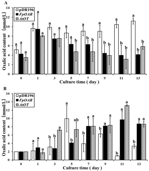 [13C]oxalic acid residue in the filtrate of pDR196- (negative control), FpOAR- (positive control), and AtOT-transformed yeast membrane vesicles. Different letters in the figure indicated significant differences among the recombinant yeast cells at p < 0.05.
