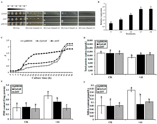 Some soluble proteins will chelate with metal ions under metal ion stress to reduce the toxic effects caused by metal ions. Therefore, the total protein (TP) content was measured as an indicator of the degree of toxicity of aluminum stress to cells (Figure 8D). The TP content of each transformant was similar under normal conditions. However, the TP content of the negative control significantly decreased and was lower than that of the FpOAR- and AtOT-transformed yeasts under 2.7 mM Al3+ stress, with it being 9014.5 μg/mL, and the TP content of the FpOAR- and AtOT-transformed yeasts decreased slightly, which were 10,327.6 μg/mL and 10,477.2 μg/mL, respectively. These results indicated that the adverse effect of Al3+ to the FpOAR- and AtOT- transformed yeasts was lesser than that of the negative control.