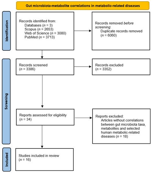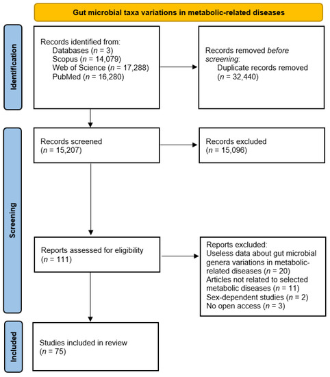Studies involving changes in gut microbial taxa in atherosclerosis, colitis, diabetes, hyperlipidemia, hypertension, metabolic syndrome, NAFLD, NASH, obesity, and steatosis and studies involving microbiota–metabolite correlations in metabolic-related diseases were assessed, screened, and selected according to PRISMA 2020 flow diagrams (Figure 1 and Figure 4) [111].