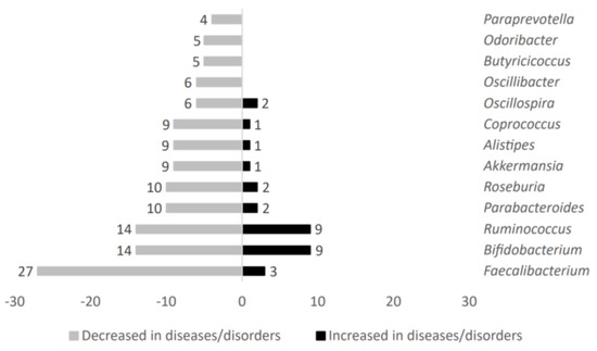 Gut microbiota genera such as Oscillibacter, Butyricicoccus, Odoribacter, and Paraprevotella were exclusively decreased in individuals affected by metabolic diseases. On the other hand, Faecalibacterium, Bifidobacterium, Ruminococcus, Parabacteroides, Roseburia, Akkermansia, Alistipes, Coprococcus, and Oscillospira were both decreased and increased in metabolic-related diseases. However, overall, these microbial genera showed a negative association with the metabolic diseases studied here.