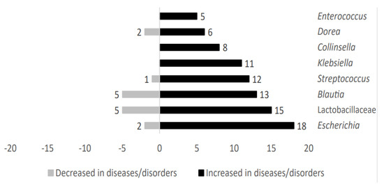Microbial genera such as Klebsiella, Collinsella, and Enterococcus were exclusively present in those cases in which individuals were affected by metabolic diseases. However, taxa belonging to Escherichia, Lactobacillaceae, Blautia, Streptococcus, and Dorea were also identified in patients without metabolic-related diseases. These microbial genera showed an upward trend in metabolic-related diseases studied here. Figure 3 shows the distribution of representative microbial taxa linked to metabolic-related diseases.