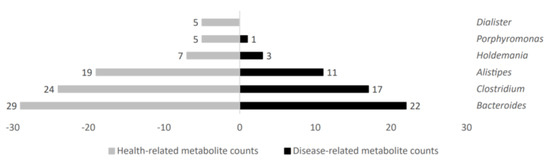 Several gut microbiota taxa showed a high metabolite count linked to disease or health status. In that regard, increased microbial metabolite counts in health status were obtained in gut microbiota genera such as Holdemania, Porphyromonas, and Dialister; further, they were also higher for Bacteroides, Clostridium, and Alistipes, but with more similar counts in both groups. Figure 5 shows representative genera differential values associated to health-related metabolite count analysis.