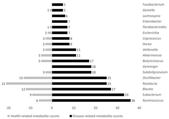 Increased metabolite counts related to disease status were linked to gut microbiota taxa such as Ruminococcus, Eubacterium, Blautia, Roseburia, Oscillibacter, Subdoligranulum, Gemmiger, Butyricicoccus, Akkermansia, Veillonella, Dorea, Coprococcus, Escherichia, Parabacteroides, Enterobacter, Lachnospira, Gemella, and Fusobacterium. Figure 6 shows representative genera differential values associated to disease-related metabolite count analysis.