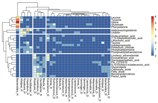 Heatmap showing the analysis where specific associations between a metabolite and a bacterial genus was found in a health and/or a disease stage (as indicated by “_H” or “_D”, respectively). For simplicity, only the representative genera and the most found metabolites were included.