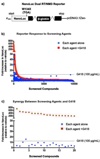 Identifying compounds from a high throughput screen (HTS) of 10,000 low molecular weight compounds for those that suppress PTCs. (a) The NanoLuc dual RT/NMD reporter shown was stably expressed in Fischer rat thyroid (FRT) cells, which were used to screen a library of ~10,000 low molecular weight compounds at a single concentration (60 μM or 30 μg/mL) for those that increase NanoLuc activity via stimulating readthrough and/or elevating PTC-containing mRNA abundance (via NMD inhibition or other mechanisms). (b) Fold-increase in NanoLuc activity in response to each of the 10,000 compounds alone (blue) or in the presence of 100 μg/mL G418 (red), relative to the DMSO vehicle control. (c) The 20 compounds produced the greatest fold increase in NanoLuc reporter response when combined with G418. In panels (b,c), the dotted line represents the NanoLuc reporter response to treatment with 100 μg/mL G418 alone.