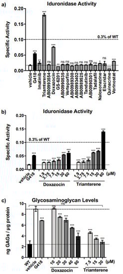Examination of primary HTS hits for the ability to restore α-L-iduronidase activity in IDUA-W402X MEFs. (a) IDUA-W402X MEFs were cultured in the presence of the top 17 screening hits at a concentration of 60 μM or 30 μg/mL (Supplementary Table S1) for 48 h. α-L-iduronidase specific activity was measured in cell lysates using a fluorescent substrate as described in Section 4 []. Each column represents the mean ± SD of a representative experiment (n = 4–6). Hits that begin with the letters “AB” are proprietary compounds of Southern Research. Samples treated with vehicle or G418 alone serve as negative and positive controls, respectively. Dose responses of (b) α-L-iduronidase specific activity (nanomoles of substrate released per μg of protein per hour) [], and (c) sulfated GAG levels [] in IDUA-W402X MEFs treated with doxazocin or triamterene. Each column represents the mean ± SD of two independent experiments (n = 6–8). In panels (a,b), the upper dashed line represents 0.3% of WT α-L-iduronidase activity, a level reported to alleviate MPS I-H phenotypes in IDUA-W402X mice []; the lower dashed line is the activity found in the negative control. In panel c, the upper dashed line represents the GAG level in homozygous IDUA-W402X MEFs, while the lower dashed line represents the GAG level in WT MEFs. For panels (a–c), samples treated with vehicle and G418 serve as negative and positive controls, respectively. Exact p values were calculated using a one-way ANOVA with Dunnett’s multiple comparisons tests where values for treated cells were compared to the vehicle control or the WT control as indicated. *** p < 0.0001; ** p < 0.001; * p < 0.05; ns indicates p > 0.05.