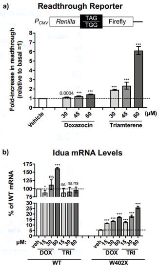 2.3. Triamterene Induces Readthrough and Stabilizes the IDUA-W402X mRNA