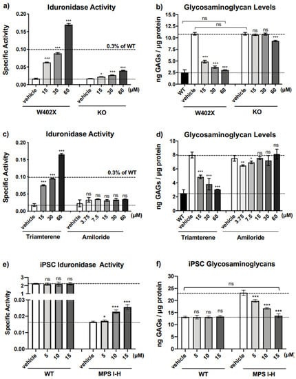 Triamterene restores α-L-iduronidase activity through a PTC-dependent manner that is unrelated to ENaC function. Cell lysates from IDUA-W402X and IDUA knock-out (KO) MEFs cultured in the presence of triamterene for 48 h were used to measure: (a) α-L-iduronidase specific activity, and (b) sulfated GAG levels []. Cell lysates from IDUA-W402X MEFs treated for 48 h with the ENaC inhibitor, amiloride, were also used to measure: (c) α-L-iduronidase specific activity, and (d) sulfated GAG levels. (e) The α-L-iduronidase specific activity, and (f) sulfated GAG levels were determined in human wild-type (WT) or MPS I-H (Q70X/W402X IDUA alleles) iPSCs ± triamterene treatment. α-L-iduronidase specific activity units in panels a, b, and e = nanomoles of substrate released per μg of protein per hour. Each column represents the mean ± SD of two independent experiments (n = 8–12). In panels (a,c), the upper dashed line represents 0.3% of WT α-L-iduronidase activity and the lower dashed line indicates the level of activity in untreated mutant cells. In panel e, the upper dashed line indicates the iduronidase activity in WT iPSCs while the lower dashed line indicates the iduronidase activity in the mutant control iPSCs. In panels (b,d,f), the upper dashed line indicates the GAG level in the control mutant MEFs, while the lower dashed line indicates the GAG level in WT MEFs. The p-values were calculated using a one-way ANOVA with Dunnett’s multiple comparisons tests where values for treated cells were compared to the vehicle control for each cohort or the WT control as indicated. *** p < 0.0001; ** p < 0.001; * p < 0.05; ns indicates p > 0.05.