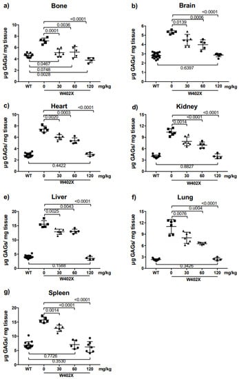 We next examined whether triamterene alleviated MPS I-H biochemical endpoints in vivo using homozygous IDUA-W402X mice, which recapitulate most of the same abnormalities observed in MPS I-H patients and respond to readthrough [,,]. We administered triamterene to eight-week-old IDUA-W402X mice via once-daily oral gavage for a total of two weeks (14 doses). After treatment was completed, sulfated GAG levels were measured in mouse tissues using a GAG dye-binding assay [,]. For all tissues examined, we found triamterene treatment led to a dose-dependent decrease in GAGs in treated IDUA-W402X mice relative to vehicle-treated controls (Figure 5). At the 120 mg/kg dose, triamterene reduced GAGs to WT levels in all tissues examined. However, administration of 120 mg/kg triamterene to IDUA-KO mice for two weeks did not lead to a reduction in GAG storage (Supplementary Figure S5), further confirming that triamterene also alleviated in vivo MPS I-H biochemical endpoints via a PTC-dependent mechanism. Longer-term studies to examine whether triamterene attenuated MPS I-H progression in IDUA-W402X mice were unsuccessful. This negative result is likely due to its greater metabolism in mice since triamterene was found to be much less stable in mouse liver microsomes than in human liver microsomes (Supplementary Figure S6a). This suggests that this higher level of metabolism of triamterene likely inactivated its ability to mediate PTC suppression in mouse tissues following extended treatment periods (Supplementary Figure S6b–d).