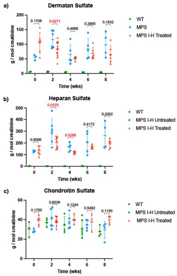 - Zhang, H.; Wood, T.; Young, S.P.; Millington, D.S. A straightforward, quantitative ultra-performance liquid chromatography-tandem mass spectrometric method for heparan sulfate, dermatan sulfate and chondroitin sulfate in urine: An improved clinical screening test for the mucopolysaccharidoses. Mol. Genet. Metab. 2015, 114, 123–128. [Google Scholar] [CrossRef] [PubMed]