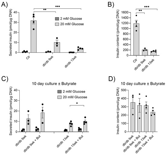 We previously showed that butyrate protects pancreatic islets from cytokine-induced dysfunction, and reduces inflammatory NF-κB signaling [38,39]. To determine whether butyrate also exerts protective effects on islets from diabetic animals at different disease stages, islets were isolated from db/db mice at 9 and 13 weeks of age. Glucose-stimulated insulin secretion was measured and compared to islets isolated from 11-week-old control C57BL/6 mice (Figure 1A).