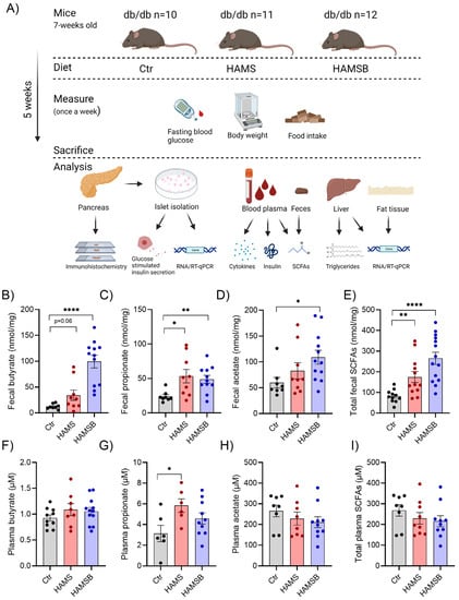 Experimental overview and SCFA concentrations in feces and plasma. (A) Db/db mice were fed either a control diet (Ctr, AIN-93G), a diet supplemented with 15% HAMS, or a diet supplemented with 15% HAMSB for 5 weeks. Blood glucose, body weight and food intake were measured weekly. After 5 weeks, the mice were sacrificed, and tissues were collected for analyses. SCFA concentrations were measured in the feces (B–E) and plasma (F–I) of db/db mice at the end of the study. Bars show the mean ± SEM. * p < 0.05, ** p < 0.01 and **** p < 0.0001.