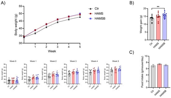 To follow disease progression, body weight (Figure 3) and fasting blood glucose levels (Figure 4) were assessed weekly. At baseline, total body weight and non-fasting blood glucose did not differ between the three groups (Figure S1). However, after 5 weeks HAMSB-fed mice had gained 15.8 ± 1.6 g of total body mass, whereas the Ctr mice only gained 13.7 ± 1.8 g (Figure 3B). Mice fed HAMS gained 14.9 ± 2.3 g (Figure 3B). The weight differences could not be explained by differences in food consumption, as the average food intake was similar among the groups (Figure 3C).