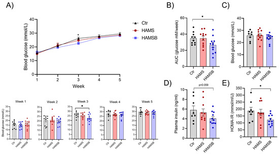 Over the course of 5 weeks, no major differences in fasting blood glucose were observed between the three groups (Figure 4A). Only in week 3 the HAMSB-fed mice had significantly lower blood glucose levels compared to the Ctr group (Figure 4B). As a measure of blood glucose control during the entire experimental period, we calculated the area under the blood glucose curve. The HAMSB-fed mice had significantly lower blood glucose compared to the Ctr mice (Figure 4B). Furthermore, we observed a non-significant (p = 0.059) decrease in plasma insulin in mice fed HAMSB for 5 weeks (Figure 4D). Analysis of fasting blood glucose (Figure 4C) and insulin levels (Figure 4D) together, in the homeostatic model assessment for insulin resistance (HOMA-IR), showed that HAMSB-fed mice had a significantly lower HOMA-IR compared to Ctr mice (Figure 4E). HAMS did not affect blood glucose, plasma insulin levels or HOMA-IR (Figure 4). Together, this indicates that although mice fed HAMSB gained more weight compared to Ctr mice, they developed less severe hyperglycemia and have improved insulin sensitivity.
