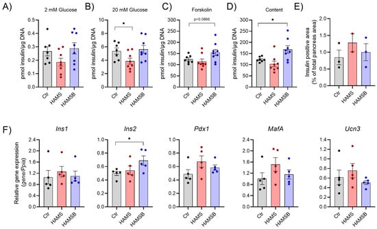 To gain better insight into the mechanisms by which HAMSB improves glycemic control, we isolated islets and assessed glucose-stimulated insulin secretion. Basal and glucose-stimulated insulin release were similar in islets from Ctr and HAMSB-fed mice (Figure 5A), whereas islets from HAMS-fed mice secreted less insulin at 20 mM glucose (Figure 5B). When glucose-stimulated insulin secretion was augmented by forskolin, a non-significant increase was observed from islets isolated from HAMSB-fed mice compared to the other groups (p = 0.086) (Figure 5C). Total islet insulin content was significantly higher (36%) in islets from mice fed HAMSB compared to islets from Ctr mice (Figure 5D). Moreover, the expression of the insulin gene Ins2 was 39% higher in islets from HAMSB-fed mice compared to Ctr mice (Figure 5F). The expression of other key beta-cell identity genes, such as Ins1, MafA, Pdx1 and Ucn3, was not significantly different between the groups (Figure 5F). Total beta-cell area, determined as insulin-positive cells per pancreas area, did not differ between the groups (Figure 5E) and no obvious difference in the number of islets and islet size was found. Together, these results show that islets from the HAMSB-fed mice express higher levels of Ins2 mRNA and contain more insulin compared to islets from control mice.