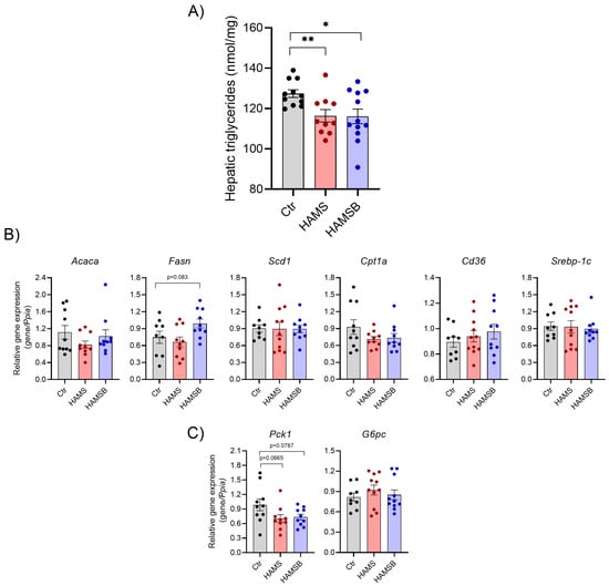 Because dysregulation of glucose and lipid metabolism in the liver promotes systemic metabolic dysfunction [41], we measured hepatic lipid accumulation and expression of genes involved in lipid and glucose metabolism. The levels of hepatic triglycerides were significantly lower (~9%) in HAMS- and HAMSB-fed mice compared to Ctr mice (Figure 6A). We analyzed the expression of genes involved in the regulation of lipid accumulation, such as uptake of fatty acids, de novo lipogenesis, fatty acid oxidation and/or export of fatty acids [42]. However, no differences were found in the expression of de novo lipogenesis genes Acaca, Fasn, Scd1 and Srebp-1c, the fatty acid transporter Cd36 and the rate-limiting enzyme in fatty acid oxidation Cpt1a (Figure 6B). The expression of Pck1, encoding phosphoenolpyruvate carboxykinase, and G6p, encoding glucose-6-phosphatase, was not statistically different between the groups (Figure 6C). Together, these results suggest that HAMS and HAMSB supplementation inhibit lipid accumulation in the liver, without affecting the expression of key genes involved in lipid metabolism.