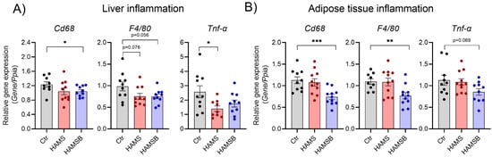 Low-grade inflammation is associated with T2D and fatty liver disease [43]. To assess local inflammation, we measured the expression of genes associated with inflammation in the liver and adipose tissue. The expression of monocyte/macrophage marker genes Cd68 and F4/80 was significantly reduced in both the liver (Figure 7A) and adipose tissue of HAMSB-fed mice (Figure 7B). A non-significant reduction in the expression of the proinflammatory cytokine Tnf-α was observed in both liver and adipose tissue by HAMSB (Figure 7A,B). HAMS significantly reduced the expression of Tnf-α in the liver (Figure 7A), but not in the adipose tissue (Figure 7B). Systemic inflammation was assessed by measuring cytokine levels in plasma. However, no differences in neither proinflammatory cytokines (IL-1β, Tnf-α, IFN-ƴ, IL-2, IL-5, IL-6 and KC/Gro) nor the anti-inflammatory cytokine IL-10 were found between the groups (Figure S2). Together, these results indicate that HAMSB ameliorates inflammation locally in the liver and adipose tissue.