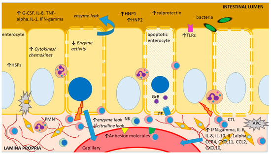 Schematic representation of the main sites and mechanisms of injury during intestinal acute rejection as well as an outline of its main consequences and features previously explored as biomarkers. APC—antigen-presenting cell, G-CSF—granulocyte colony-stimulating factor, CCR—CC chemokine receptors, CXCL—chemokine (C-X-C motif) ligand, CTL—cytotoxic T lymphocyte, GrB—granzyme B, HNP—human neutrophil protein, HSP—heat shock protein, IFN—interferon, IL—interleukin, NK—natural killer cell, PF perforin, PMN—polymorphonuclear, TLR—toll-like receptor, TNF—tumor necrosis factor. The figure was produced using Microsoft PowerPointTM.