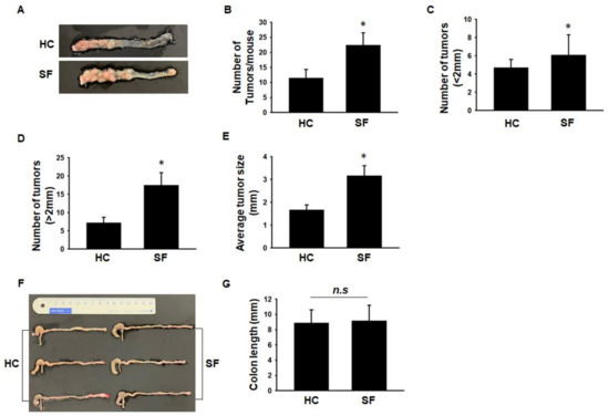 In Experiment 1, we compared the tumor number and size between the HC and SF groups after sacrificing the mice. The total number of tumors was significantly higher in the SF group than in the HC group (Figure 1A,B). We classified tumor size as <2 mm or >2 mm. The number of tumors larger and smaller than 2 mm was both significantly higher in the SF group than in the HC group (Figure 1C,D). The tumors were also larger in the SF group than in the HC group (Figure 1E). Inflammation is known to shorten colon length, so we measured colon length to assess whether SF exacerbated the inflammatory status of the colon in the AOM/DSS-treated mice. The colon length did not differ significantly between the HC and SF groups (8.9 ± 1.7 vs. 9.2 ± 2.0) (Figure 1F,G).