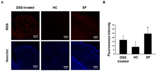 Confocal microscopic images showing ROS in colon tissue from mice in the DSS-treated, HC, and SF groups. (A). Representative confocal images of ROS in the colons of mice in the 2% DSS-treated (n = 3), HC (n = 5), and SF (n = 5) groups. (B). Comparison of fluorescence intensity showing ROS in colon tissues across the groups. Data are presented as the mean ± S.E.M. * p < 0.05 compared with the HC group, as determined by the Mann-Whitney U test.