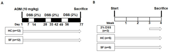 Thirty-seven male, 8-week-old C57BL/6 mice (DBL Co., Ltd., Eumseong, Republic of Korea) were used in this study, which consisted of two different protocols (Figure 5A,B). The first protocol (Experiment 1) examined the effect of SF on colon carcinogenesis. The mice in Experiment 1 were randomly divided into two groups: home cage control (HC; n = 12) and SF (n = 12). Mice in both groups received one intraperitoneal injection of AOM (10 mg/kg; Sigma-Aldrich, St. Louis, MO, USA). Then, the mice in the HC and SF groups were exposed to normal conditions and the SF protocol, respectively, for 77 days. 2% DSS (MP Biomedicals, Santa Ana, CA, USA) was given in the drinking water on Days 7–14, Days 28–35, and Days 49–56. The mice were sacrificed on Day 77, and tissue samples were harvested for further analysis. The second protocol (Experiment 2) tested our hypothesis that SF alone can elevate reactive oxygen species (ROS). Mice in the HC (n = 5) and SF groups (n = 5) were maintained in normal conditions and the SF chamber for 4 weeks without any administration of AOM or DSS. The 2% DSS group (n = 3) was given 2% DSS in their drinking water between 3 and 4 weeks as a positive control of the ROS measurements. Both experimental protocols were approved by the Jungwon University Institutional Animal Use and Care Committee and are in close agreement with the NIH Guide on the Care and Use of Animals.