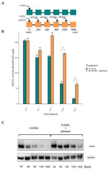 Galactose co-administration improves rh-AGAL stability in FD cells. Patient-derived fibroblasts defective of AGAL (IF-NULL) were treated with 1.5 µg/mL rh-AGAL (agalsidase β) in the presence or the absence of 100 mM galactose; galactose was then added in the culture medium for seven days, as sketched in panel A. Cells were collected and lysed, and AGAL quantity was assessed via enzyme activity assay (panel B) and immunoblot (panel C). The improvement of rh-AGAL stability over the seven days was detected (two-tailed unpaired t-test, n = 2; * = p < 5 × 10−2; panel B: 120 h, adj. p.0.0154; 168 h, adj. p.0.0233).