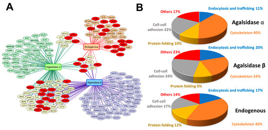 Graphical representation of AGAL and rh-AGAL interactomes and their functional clustering. Panel A: Cytoscape network representing putative AGAL interactors, identified by their MGI gene symbols. In the graph, nodes represent proteins, and lines represent interactions. The nodes are selectively identified as endogenous AGAL, agalsidase β and agalsidase α; protein partners are reported in light red, light violet, and light green, respectively. The shared interactors between different conditions are shown. Red ellipses mark druggable proteins, according to Drugbank. Panel B: Functional analysis of proteins identified as agalsidase α (upper pie), agalsidase β (middle pie), and endogenous AGAL (lower pie)-interacting proteins clusterized according to biological processes and cell components to which they belong.