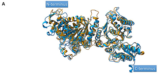 The published X-ray structure of hE1a (PDB ID: 6U3J, ref. [35]) and the cryo-EM structure of hE1o (PDB ID: 7WGR ref. [20]), as well as the hE1o structure from the AlphaFold Protein Structure Database (https://alphafold.ebi.ac.uk/search/text/AF-Q02218-F1 (accessed on 12 September 2021)), were used throughout this study. The sequence alignment (see Figure 1) showed that the two E1 proteins have 36.3% sequence identity and a Cα root-mean-square deviation (RMSD) of 3.97 Å. Comparing the cross-links found for hE1a and hE1o (Table 1), we noted that the linked residues of hE1a and hE1o are generally not equivalent. In no case were the cross-linked residues the ones expected on the basis of structural and sequence-based alignments. The finding that the N-terminal region peptides 26–39 (hE1o) and 24–47 (hE1a), which both displayed decreased deuterium uptake upon binding to hE2o [31,32], were shown to be unique in the two proteins (Figure 1B), also suggested different binding modes for hE1a and hE1o to hE2o.