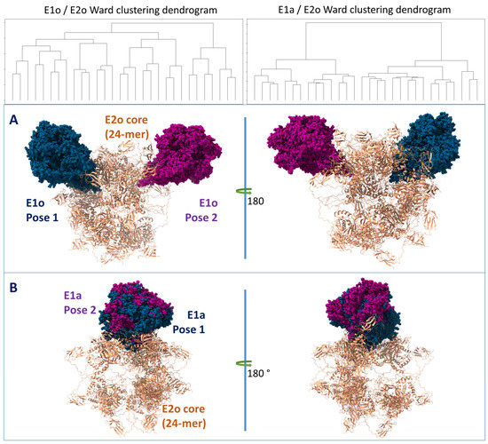 The best docking orientations for the binary subcomplexes hE1o-hE2o and hE1a-hE2o. (Top) Ward clustering dendrograms for the two subcomplexes. (A) Model docking for hE1o and hE2o. (B) Model docking for hE1a and hE2o. Model docking was performed in the Schrödinger program suite [37]. The AlphaFold Protein Structure Database was used for hE1o (ID: Q02218-F1) (https://alphafold.ebi.ac.uk/search/text/AF-Q02218-F1 (accessed on 12 September 2021)) and hE2o (P36957-F1) (https://alphafold.ebi.ac.uk/search/text/AF-P36957-F1 (accessed on 12 September 2021)). The reported X-ray structure of hE1a (PDB ID: 6U3J [35]) was used.